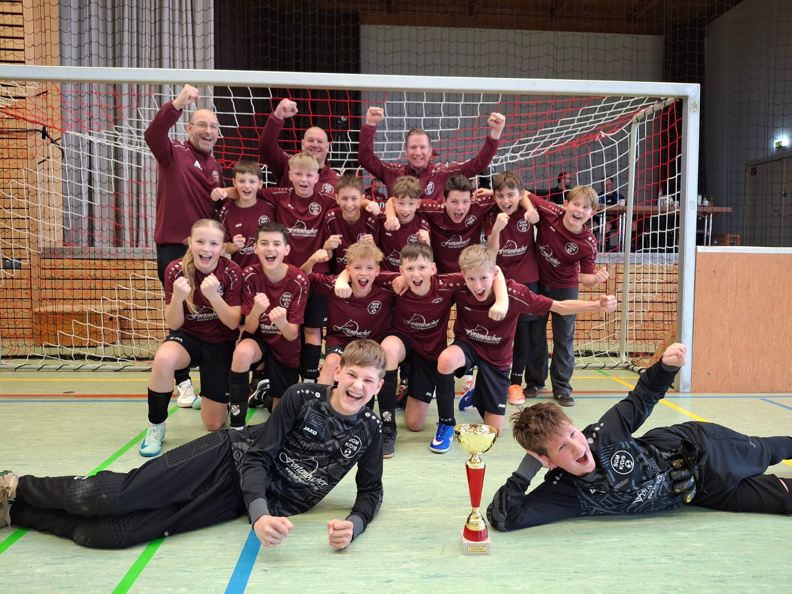 Beim Wuschel-Cup in Nufringen trat die SG K/D/S mit zwei Mannschaften an. Während für die zweite Mannschaft gegen meist ein Jahr ältere Teams bereits in der Vorrunde Schluss war, konnte sich die D1 in der deutlich leichteren Gruppe mühelos für das Halbfinale qualifizieren. Dort musste nach einer durchwachsenen Leistung das Neunmeterschießen für eine Entscheidung sorgen. Alle SG-Kicker trafen ins Netz. Anton Fischer im SG-Tor parierte einen Versuch und war damit der Garant für den Einzug ins Endspiel. Den Nachwuchsspielern war die Nervosität vor dem Anpfiff anzumerken. Mit vollem Fokus gingen sie das allesentscheidende Match gegen die JSG Hengstett an und erwischten einen Bomben-Start. Vom Anpfiff weg spielte Jonas Kehl zurück auf Torwart Fischer. Dessen langer Ball landete direkt bei Lian Sonnberg, der einen Gegenspieler aussteigen ließ und übersichtlich auf Jonas Kehl querlegte. Der quirlige Techniker schob nach wenige Sekunden für sein Team zum 1:0 ein. Dadurch war die Zeit auf Seiten der SG und die eingeschworene Mannschaft von Trainer Steffen Kehl warf alles in die Waagschale. Konzentriert und diszipliniert verteidigten sie die Führung, bis Tim Tomaschko mit einer Einzelaktion für die Entscheidung sorgte. Mit seinem schwächeren linken Fuß traf er zum 2:0-Endstand und der Jubel kannte keine Grenzen mehr! „Die Jungs und Emma haben heute für ihren langjährigen Trainer Steffen Kehl den Turniersieg geholt“, sagte Co-Trainer Steffen Marquardt. „Das macht uns unglaublich stolz!“