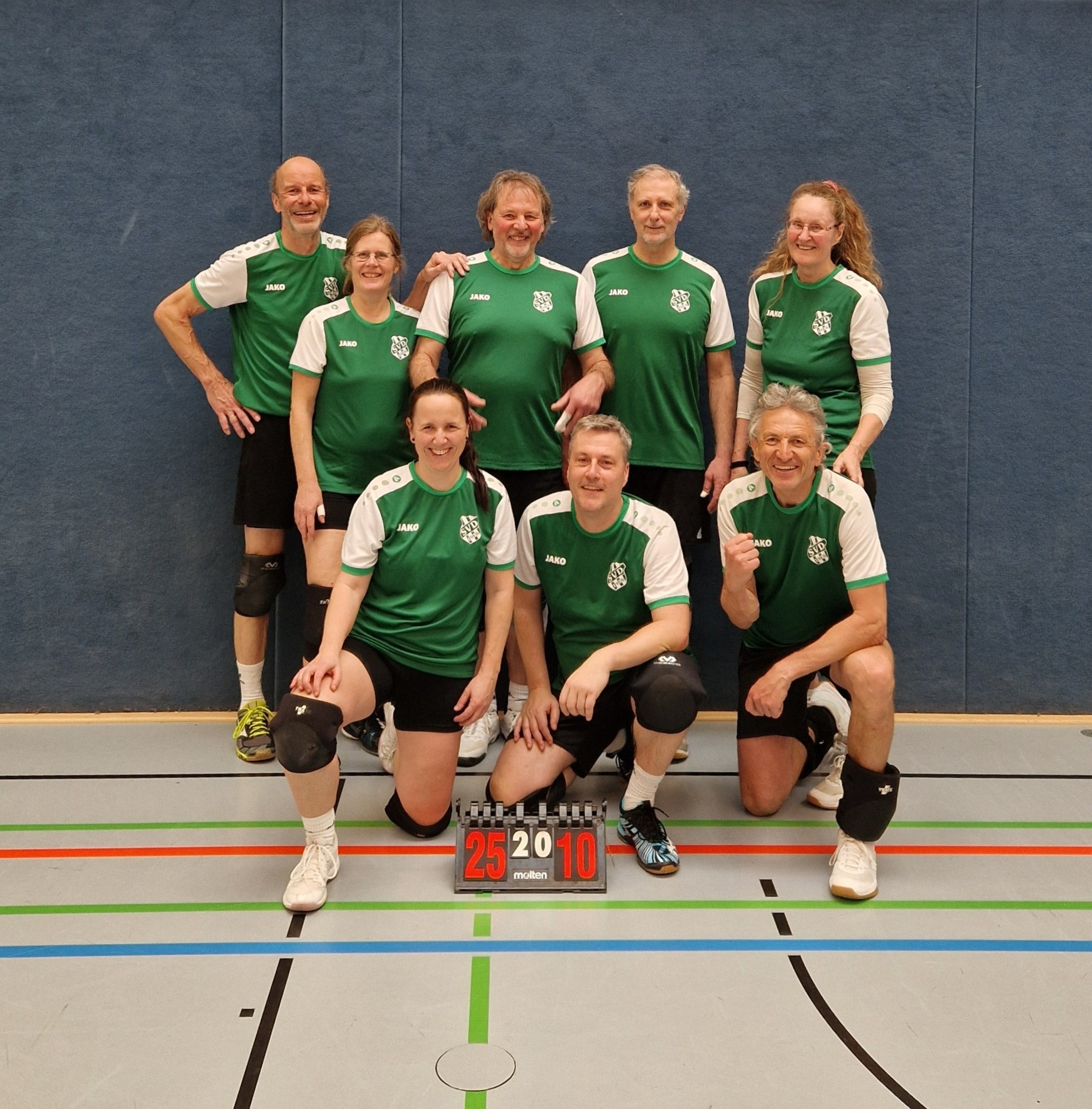 Am letzten Spieltag der Saison 25/26 zeigte das SVD 2/4-Team seine mit Abstand beste Saisonleistung und überzeugte mit 2 klaren Siegen gegen den Tabellenzweiten Leidringen und Gastgeber Ergenzingen. Damit sicherte der SVD den 4. Tabellenplatz ab, punktgleich mit dem Dritten und nur einen Punkt hinter dem Vizemeister. Der SVD war an diesem Tag vom ersten bis zum letzten Ball hellwach und den Gegnern in allen Belangen überlegen. Gastgeber Ergenzingen ließ man überhaupt nicht ins Spiel kommen und setzte sich sofort mit 10:2 Punkten ab. Die Abwehr brachte die Bälle sicher zu den Zuspielerinnen, so dass diese die Angreifer immer wieder variantenreich ins Spiel bringen konnten. Der Angriff punktete fast nach Belieben, die wenigen Angriffsversuche der Ergenzinger waren meist eine sichere Beute des SVD-Mittelblocks. Erst in der 2. Satzhälfte kamen die Gastgeber etwas besser ins Spiel, konnten aber nicht verhindern, dass der SVD beim Stand von 24:18 gleich 5 Matchbälle hatte. 3 Mal konnte Ergenzingen mit spektakulären Aufschlägen den Satzverlust abwehren und das Ergebnis noch etwas freundlicher gestalten. Dann verwandelte der SVD den 4. Matchball zum Satzgewinn.